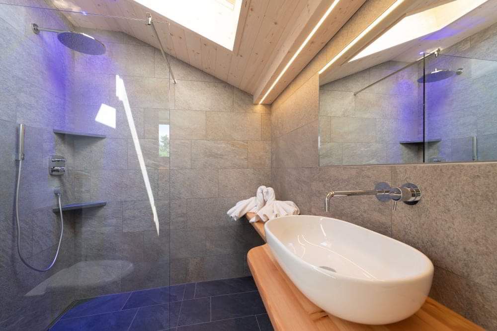 - ein modernes Badezimmer mit Erlebnisdusche, Haarföhn, Bademäntel, Waschlotion